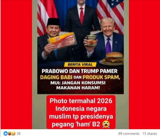 Dengan demikian, unggahan yang mengklaim Presiden Prabowo dan Presiden Trump memamerkan produk daging babi dan spam kaleng adalah hoaks. Foto tersebut telah dimanipulasi dan narasinya tidak sesuai dengan isi perjanjian perdagangan yang sebenarnya.