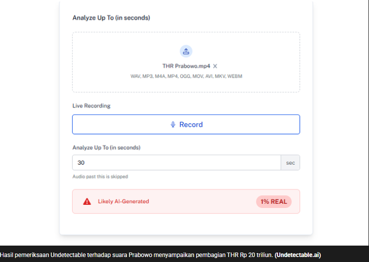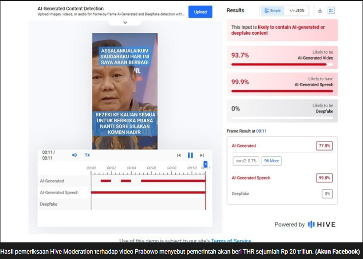 Hive Moderation mendeteksi bahwa suara dalam video yang menyerupai Prabowo memiliki probabilitas hingga 99,9 persen dihasilkan oleh teknologi AI. Sementara itu, analisis dari Undetectable juga mengonfirmasi bahwa suara tersebut merupakan AI generatif, bukan suara asli.